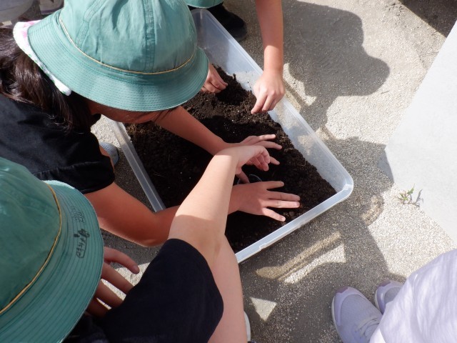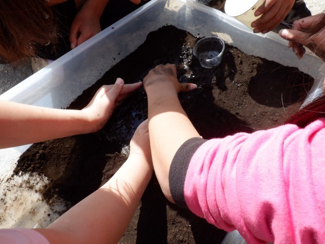 水の流れを見やすくするために、少し砂利を入れた水を流したり、流れやすいように道筋を作ったりと工夫していました。