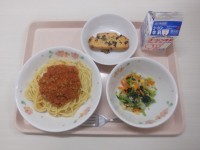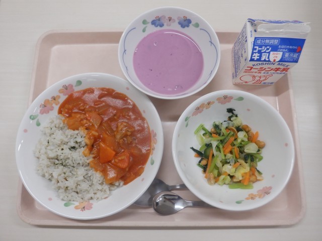 10月10日は目の愛護デーです。数字の10を横にすると、人の眉と目に見えることからこの日に決まりました。 今日の給食ではそんな目の愛護デーにちなみ、ブルーベリーヨーグルトを提供しました。ブルーベリーには、目によいとされるアントシアニンが豊富に含まれています。ブルーベリーソースは給食室の手作りです。冷凍ブルーベリーとブルーベリージャム、砂糖、水を加熱してソースを作り、ヨーグルトと混ぜ合わせて提供しました。甘さもちょうどよく、子供たちは喜んで食べてくれました。
