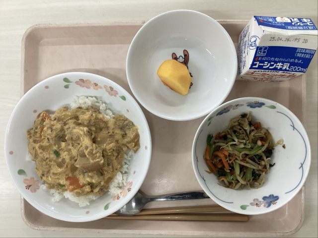 篠崎小の給食で使用した柿の量は110個です。柿は専用の皮むき器が給食室にないので、全て手作業で皮をむきます。これが意外と大変な作業です。調理師さんは2時間近くかけて柿の皮をむき、一人分ずつにカットしていただきました。旬の味をおいしく食べることができたでしょうか。