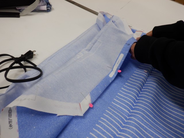 アイロンであとをつけたら、まち針で固定していきます。まち針のさし方も大きな画用紙と大きなまち針を使っての説明があったので、スムーズに取り組むことができました。