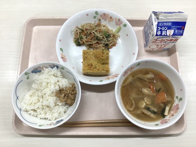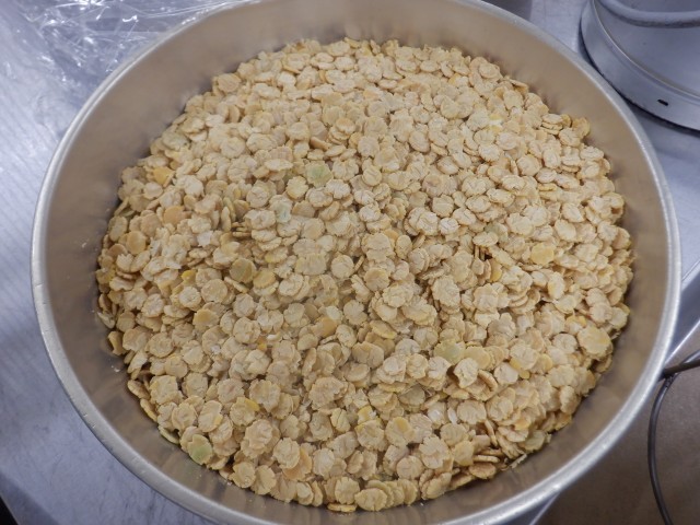 今日のみそ汁の中には「打ち豆(うちまめ)」を入れて作りました。打ち豆とは、水で煮た大豆を平たくつぶし、乾燥させたものです(写真2)。北陸や東北といった、雪の降る寒い地方で昔から親しまれてきました。大豆を乾燥させることで長期間保存することができ、平たくつぶしてあるおかげで調理時間も短くすむため、手軽に大豆たんぱく質を摂取することができます。