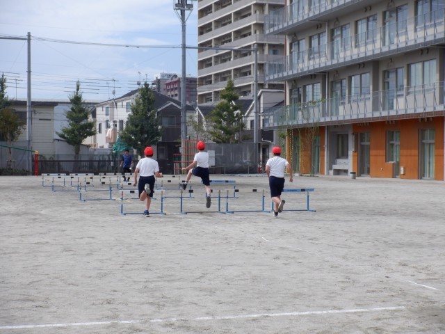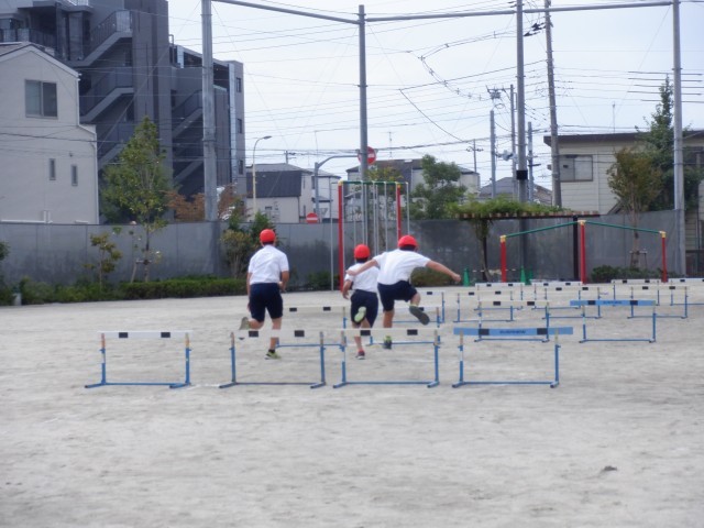 今日は最初、40m走のタイムを測って、ハードルの越え方の練習をしました。