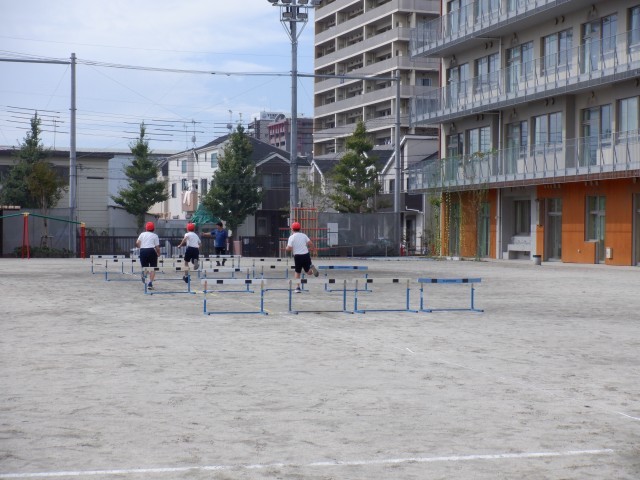 足の向きに注意して練習を繰り返し、最後に40mハードル走のタイムを測りました。