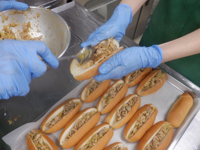 やきにくドッグは、コッペパンに炒めたぶた肉とキャベツをはさんで焼きました。手作りの焼肉のタレで味付けをしています。