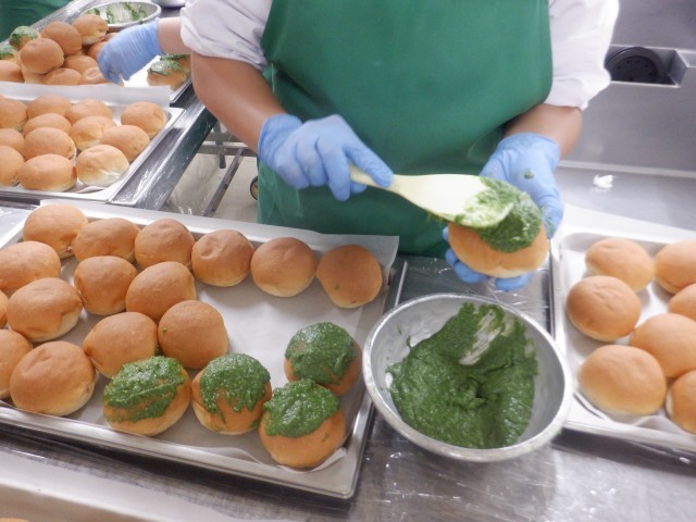 小松菜ビスキュイパンは、小松菜入りのクッキー生地をパンの上にぬり、オーブンで焼きました(写真3)。パンの中にはいちごジャムも塗ってあります。