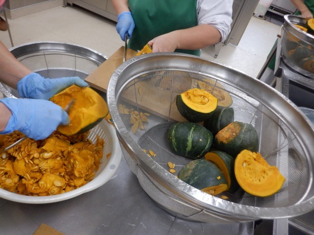 今日はハロウィン献立です。篠崎小の給食室から、手作りのパンプキンパイを提供しました。