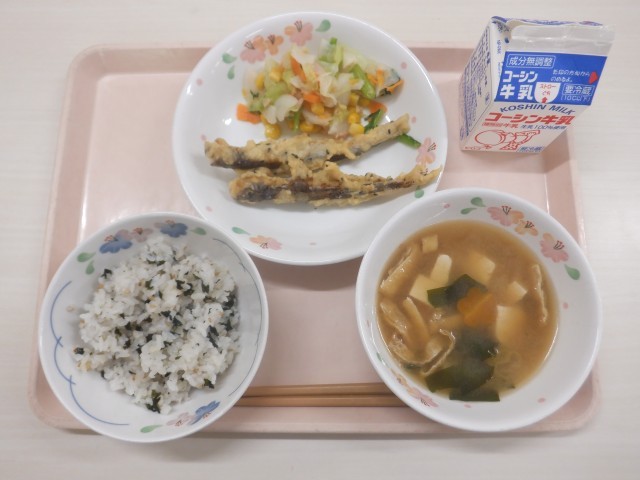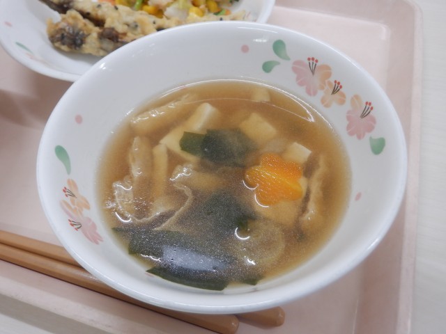 この話は実在する女の子の話です。はなちゃんは毎朝5時に起きて、パパと一緒におみそ汁を作ります。今日の給食では、この絵本の最後のページに載っている「はなちゃんの豆腐とわかめのみそ汁」を再現しました。また、はなちゃんの名前にちなみ、にんじんを花の形にしてみそ汁の中に入れました。