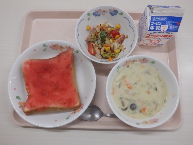 トーストにぬったりんごジャムは給食室の手作りです。紅玉という、お菓子作りにぴったりなりんごを使用しました。紅玉は生で食べると酸味がとても強いのですが、この酸味のおかげで加熱してもりんごの味がぼやけず残ります。