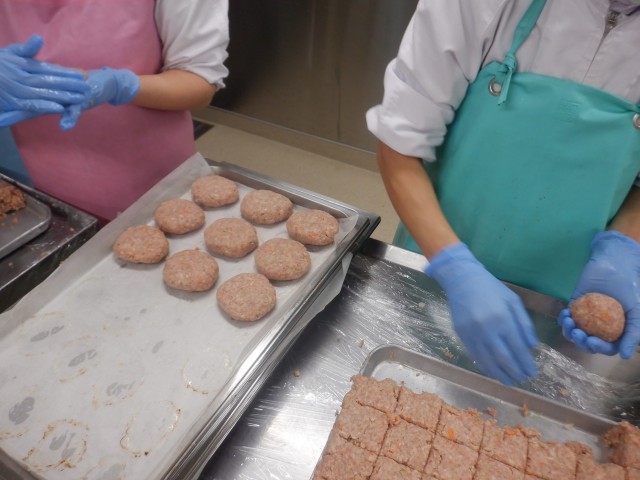 ハンバーグを作っているところです。お肉の他におからを入れ、臭みけしは牛乳ではなく豆乳で行いました。