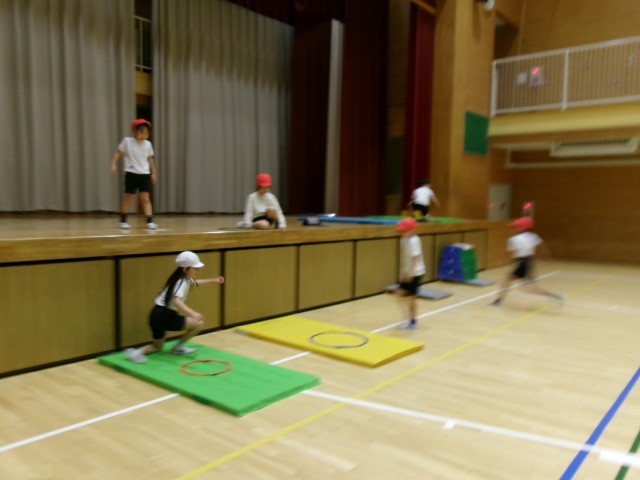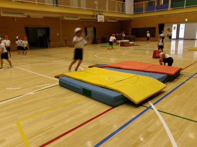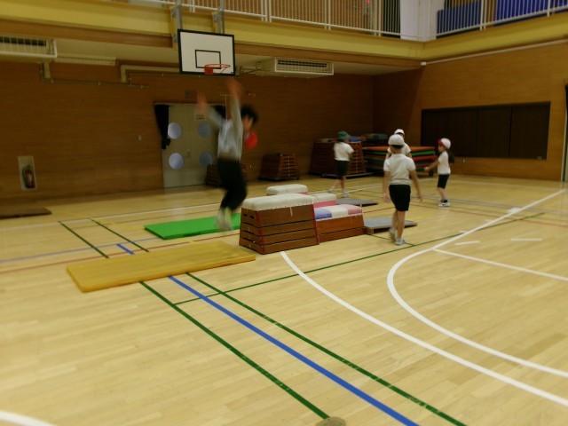 体育「とび箱運動あそび」を副校長先生と学習しました。エバーマットを使ったふわふわの場、ステージからジャンプするぶたいの場などで、跳び箱を飛び越したり、前転したりしていました。