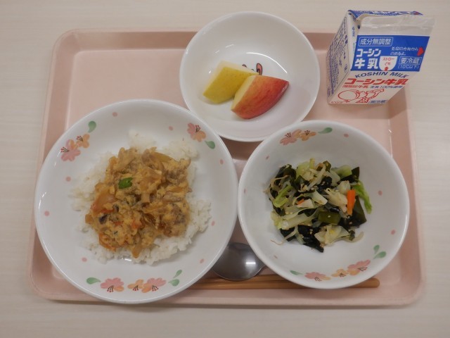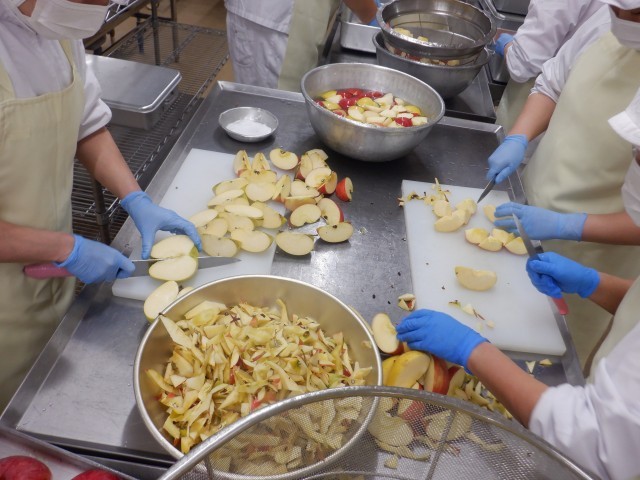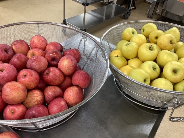 デザートはりんごの食べ比べでした。八百屋さんが旬のりんごを2種類持ってきてくださいました。赤色がサンふじ、黄色がシナノゴールドでした。児童は交互に食べたり、じっくり考えながら味わったりしている様子が見られました。