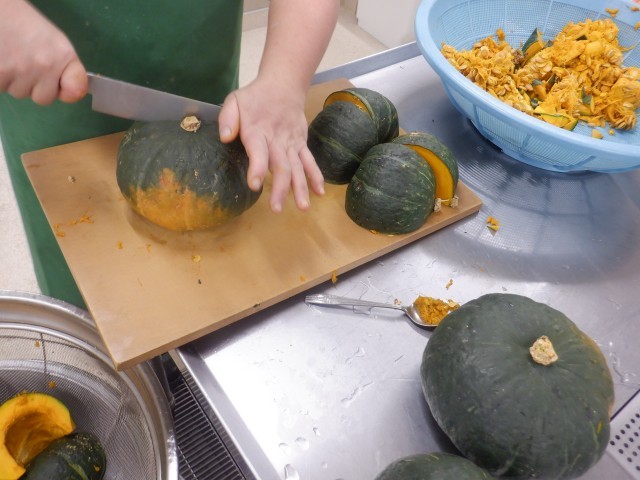 山梨県を代表する郷土料理です!麺の幅が広く平たいのが特徴で、かぼちゃなど季節の野菜と一緒に煮込んで作ります。今日は17kgのかぼちゃを使って作りました(写真2)。