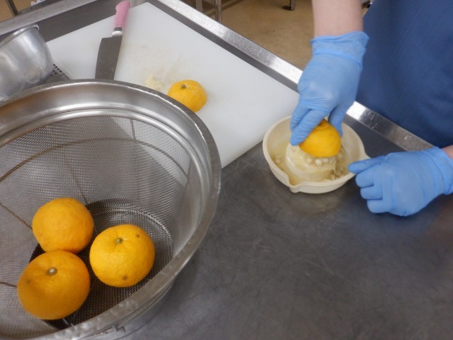 郷土料理ではありませんが、冬至にゆず湯に入る習慣にちなみ、ゆずを使ったあえ物です!果汁ときざんだ皮どちらも使用し(写真3)、さわやかなゆずの香りをつけました。