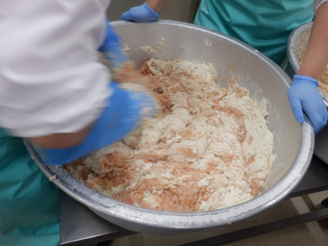 今日は豆腐ハンバーグを作りました。木綿豆腐をミキサーにかけ、なめらかにしたものをお肉と混ぜています(写真2)。しっかりとよくこねて作ったので、やわらかくジューシーなハンバーグができました。