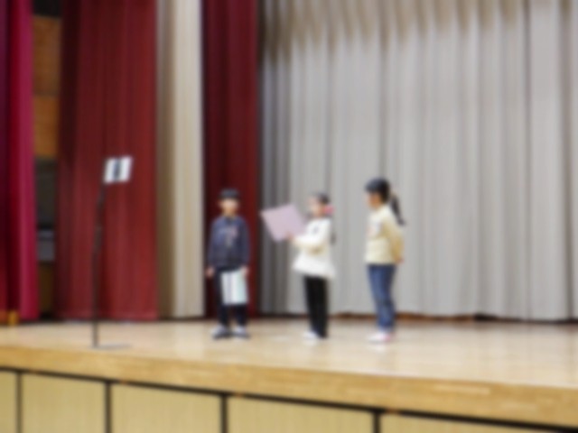 終業式では、1年生の代表児童3名が、2学期の振り返りや3学期の抱負を話しました。