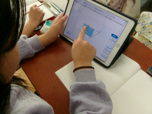 5年生は、「四角形と三角形の面積」の学習に取り組んでいます。今日は、デジタル教科書を活用して、どうすれば平行四辺形の面積を求められるか試行錯誤しました。子どもたちからは、「長方形に直せば計算できるかもしれない!」と自分たちで解決策を見つける姿が印象的でした。今まで学習した形に変形させる考え方に気づき、学びを深めることができました。