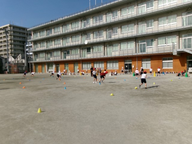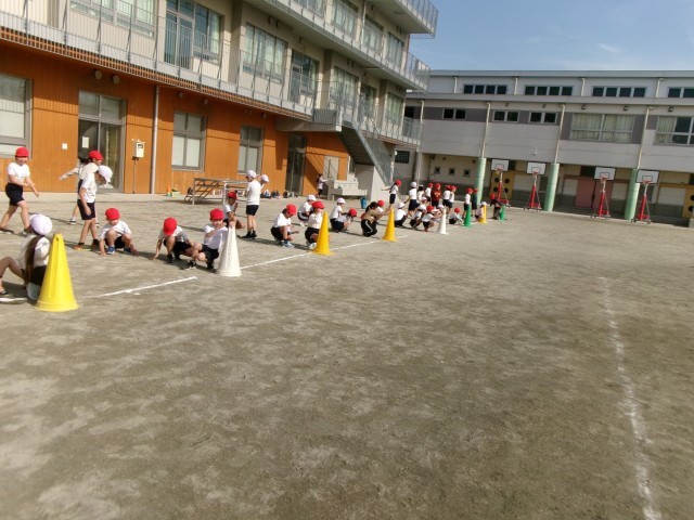 体育「走の運動」では、ケンパやスキップなどのいろいろな走り方をしています。グループでミニコーンを並べて自分たちでコースを作って、ジャンプしたりよけたりしながら走ったりしています。できるだけ速く走ることができるように工夫して、楽しんでいます。