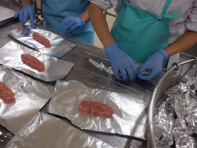ドイツでは冬の厳しい寒さに備えるため、保存食の文化が発展しました。ソーセージは豚肉を長期間食べることができるよう工夫して生まれた料理です。ドイツには、ソーセージの種類が1500種類もあるそうです。 給食では羊腸の代わりにアルミホイルで包んで提供しました(写真2)。豚ひき肉とみじん切りにした玉ねぎ、セロリー、たまご、牛乳、そしてスパイスを合わせて捏ねて本格的に作りました。使用したスパイスはセージとナツメグです。セージというスパイスは、ソーセージの語源になったと言われています。