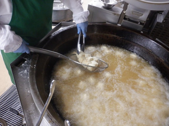 揚げ豆腐には、そぼろあんをかけていただきました。押し豆腐を人数分にカットし、揚げる直前に片栗粉をまぶしてカリッと揚げました(写真2)。豆腐が苦手な子も、そぼろあんと共に食べることでおいしく食べられたようです。