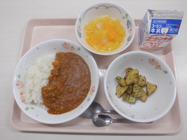 今日は学校公開がありました。土曜日も頑張って学校へ来た児童の楽しみとなるような献立内容にしました。キーマカレーは食材を全てみじん切りにし、3時間近く煮詰めて作りました。低学年と高学年でスパイスの量を変えて辛さを調節したので、どの学年も食べやすかったようです。雪の降る寒い日でしたが、冷たいデザートのフルーツポンチは変わらずの人気でした!