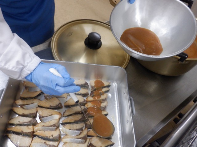 今日の主菜は「ブリのみそ照り焼き」でした。下味をつけたブリをオーブンで焼き、上から手作りのみそだれをかけました(写真2)。みそだれは赤みそをベースに、しょうゆやさとう、生姜を入れて煮詰めて作りました。甘めに仕上げたみそだれとブリの相性がよく、おいしく作ることができました。