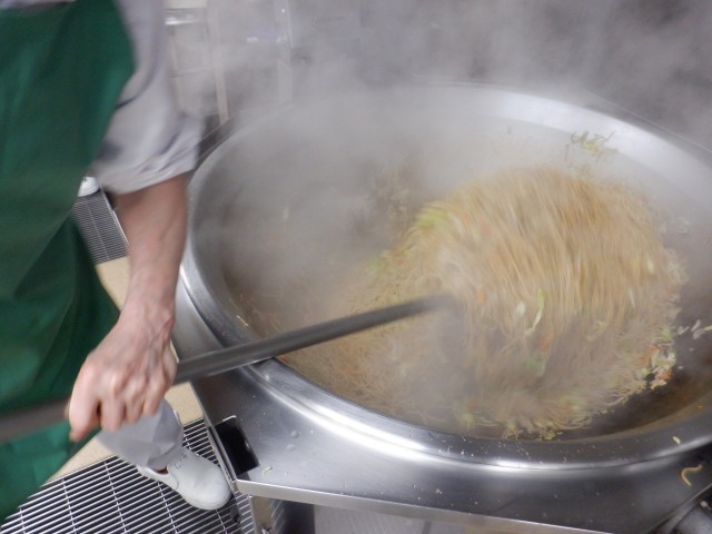今日は久々の焼きそばでした。焼きそばに使用した麺は50kgと大量です。麺と共に野菜や肉も炒めるので、とても力のいる作業ですが、調理師さんは頑張って炒めてくれました(写真2)。