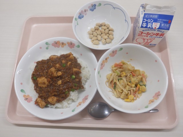 今日はマーボーどうふ丼でした。給食の麻婆豆腐は、たっぷりの野菜と豆腐を一度にとることができる、栄養満点の一品です。篠崎小では、味付けに甜面醤や豆板醤を使用し、本格的な仕上がりにしています。豆板醤は低学年と高学年で使用量を変え、それぞれの学年が食べやすい辛さに調整しています。
