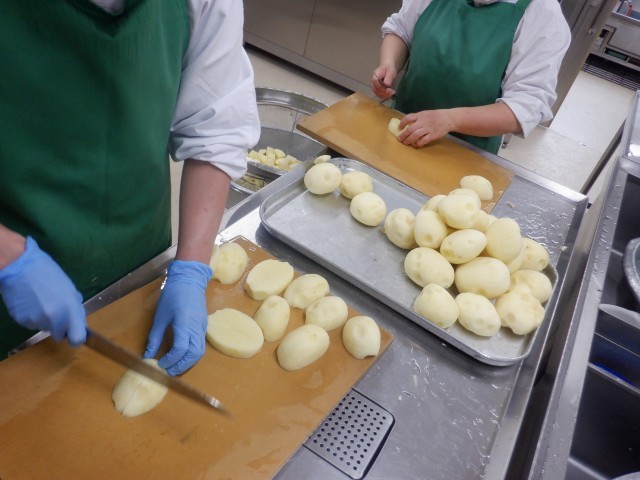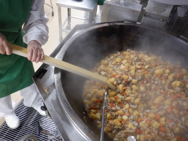 今日の肉じゃがは、新じゃがを使って作りました。新じゃがとは、収穫してすぐに出荷されたじゃがいものことです。通常のじゃがいもに比べ、水分を豊富に含んでいるので、みずみずしくしっとりとした食感を楽しむことができます。そんな新じゃがを50kg使用して作った肉じゃがは大好評でした。ごはんも進んだようで、残りも少なかったです。大量のじゃがいもを、調理師さんは手作業でカットしてくださいました(写真2)。肉じゃがに使用した具材は、じゃがいもの他に玉ねぎやにんじん、しいたけ、こんにゃく、ぶた肉などです。全ての食材に味が染み込むよう、時間をかけて煮込みました(写真3)。