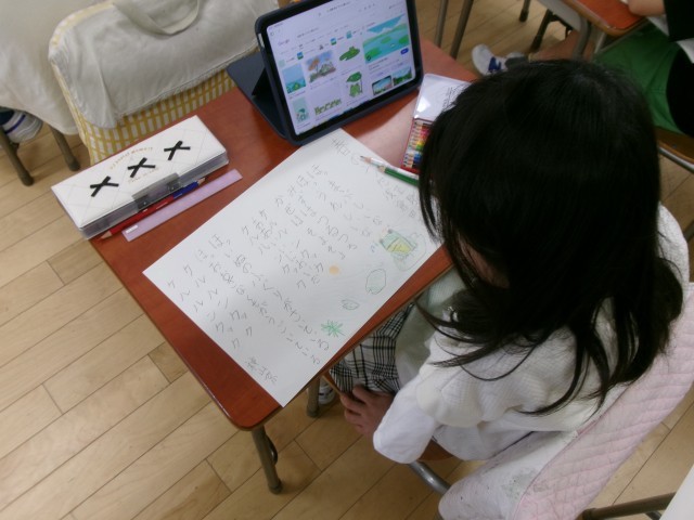 4年生の国語では、詩「春のうた」の学習をしました。「ケルルンクック」をリズムよく、「ほっ」をかえるの気持ちになりきって音読をしました。それぞれの言葉にどんな気持ちが込められているのか想像しながら詩を楽しむことができました。また、視写をして、「春のうた」をイメージしながら絵を描きました。