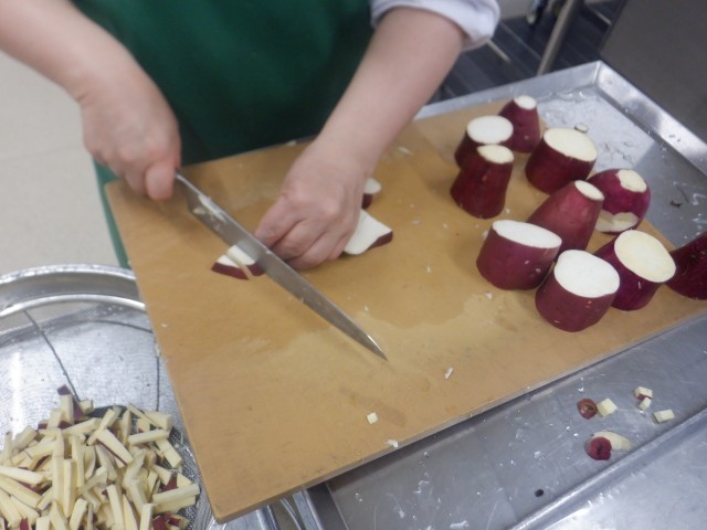キャンディポテトは、カリッと揚げたさつまいもに、ざらめとバターで作った蜜を絡めて提供しました。手作業でさつまいもを切りました(写真2)。