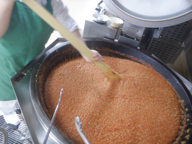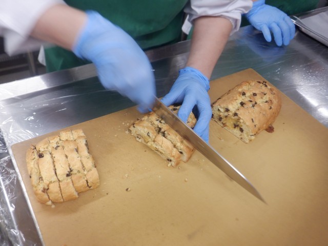 今日のデザートは、イタリアの伝統的なお菓子「ビスコッティ」です。「ビスコッティ」の「ビスコ」は、「二度焼いた」という言葉がもとになっています。その名の通り、生地を2回焼いて作ります。給食室では、生地を一度焼いてから一人分にカットし(写真2)、さらにもう一度焼き上げました。二回焼いているため、普通のクッキーよりもザクザクとした食感が特徴です。中にはチョコチップが入っており、風味も豊かです。カットする際に崩れてしまった部分もおまけとして提供しましたが、どのクラスでも大人気で、残りはほとんどありませんでした。