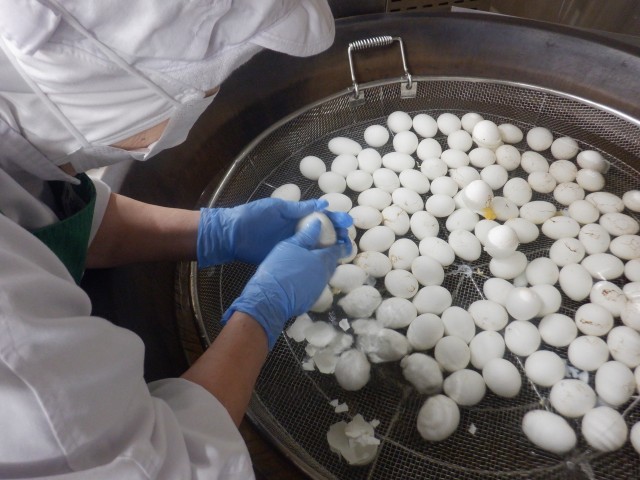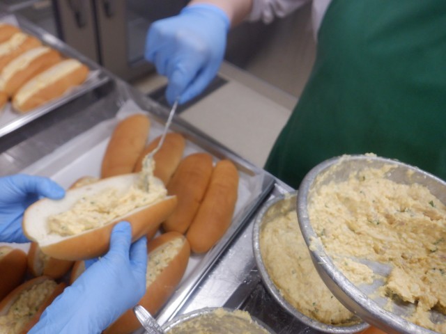 たまごツナドッグのたまごは、給食室でゆでたまごを作り、一つひとつ丁寧に殻をむきました(写真2)。調理師さんは、殻が混入しないよう入念に確認しながら作業を進めてくださいました。殻をむいたたまごは潰し、ツナと玉ねぎ、マヨネーズと合わせてパンに挟み、焼き上げます(写真3)。ゆでたまごをなめらかになるまでしっかり潰したことで、口当たりのよい仕上がりになりました。