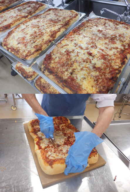 今日は久々の手作りパンでした。夏の暑さがまだ残る日でしたので、生地の発酵具合もよく、ふわふわなパン生地が完成しました。そこに手作りのピザソースをぬり、上から具をのせて焼きました。給食室は朝から大忙しでしたが、みんなで力を合わせて完成することができました。給食時間に教室を回ると、「お店のパンみたい!」と喜んで食べてくれる児童の姿を見ることができました。