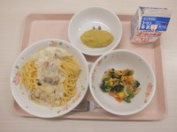 今日の給食ではそんな目の愛護デーにちなみ、ブルーベリーヨーグルトを提供しました。ブルーベリーには、目によいとされるアントシアニンが豊富に含まれています。ブルーベリーソースは給食室の手作りです。冷凍ブルーベリーとブルーベリージャム、砂糖、水を加熱してソースを作り、ヨーグルトと混ぜ合わせて提供しました。甘さもちょうどよく、子供たちは喜んで食べてくれました。