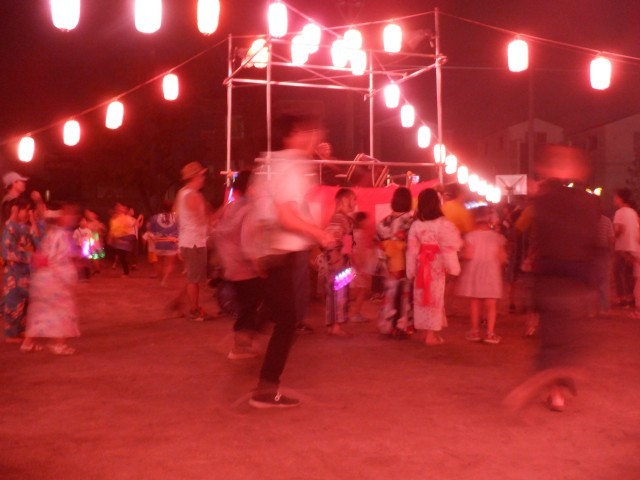 18時半、太鼓の威勢のよい音が鳴り響き、開始から大勢の子供も大人の方も集まってきました。子供たちも踊りの輪に入って、楽しく踊っていました。