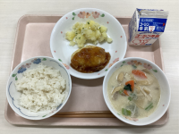 ※梅雨の時期になると、色とりどりのあじさいを見かける機会が増えます。今日のデザートは、2色のゼリーを角切りにして合わせたあじさい寒天です。