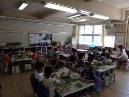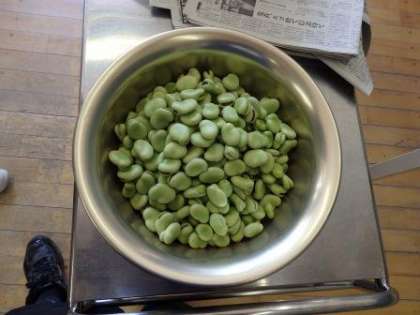 そらまめのさやむきを体験しました!『そらまめくんのベッド』のように実際の皮の内側もふかふかでしたね!観察も丁寧にすることができました。子どもたちが頑張ってむいたそらまめはおいしく給食でいただきました。