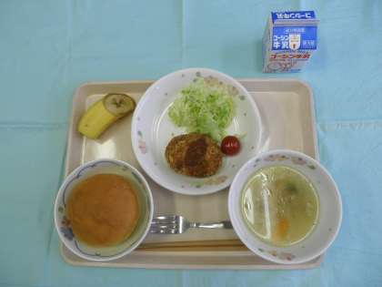 まるパン だいずコロッケ ゆでキャベツ ミニトマト きのこスープ バナナ