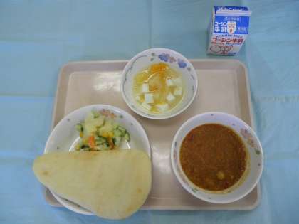 ナン チキンカレー ポテトサラダ フルーツぎゅうにゅうかんてん