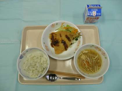 バターライス アジフライ アスパラサラダ とうふとえのきのスープ