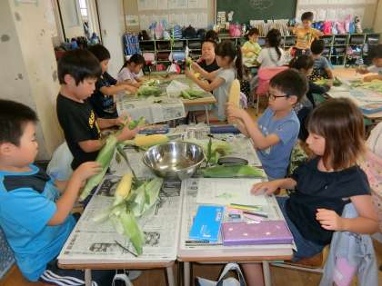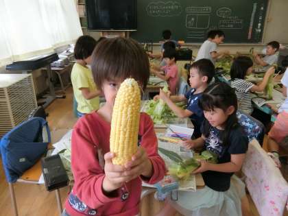 2年生は、給食のとうもろこしの皮むきをお手伝いしました。楽しく皮むきをして、給食の時間には、自分たちがお手伝いをしたとうもろこしを、嬉しそうに、残さず、おいしくいただきました。お手伝いをして、栄養士さんや給食主事さんがいるから、毎日おいしい給食が食べられるということも実感しました。