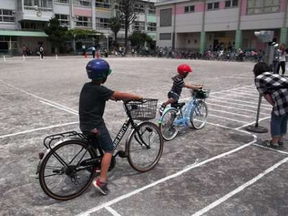校庭では、実際に自転車に乗って、周囲の安全確認の仕方や、道路の渡り方などを詳しく教えていただきました。