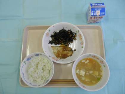 ごはん さばのぴりからやき ひじきとだいずのにもの すりごまのみそしる