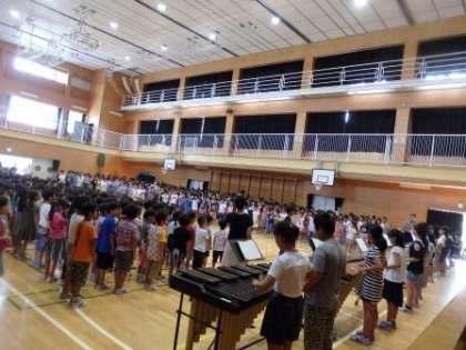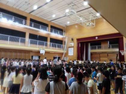 今日(7月19日)は音楽朝会でした。音楽委員さんの素敵な演奏に合わせて「世界中の子どもたちが」を元気よく楽しく歌うことができました。最後には世界の遊び「フランスのじゃんけん」について紹介があり、みんな楽しんで挑戦する姿がみられました。