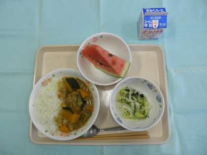 ※今日の給食に使った、かぼちゃときゅうりとスイカはすべてウリ科の植物です。育つスピードが速く、つるを伸ばして成長する特徴があります。