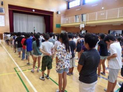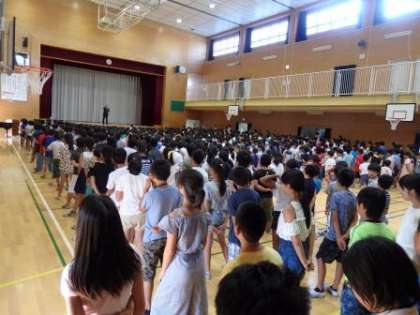 本日、1学期の終業式が行われました。全学年暑い中でしたが、校長先生のお話に耳を傾け、集中して聞くことができました。また、生活指導の先生から「いかのおすし」についてのお話がありました。ルールを守り、安全に過ごしましょう。・・・ついに、夏休みが始まります!規則正しい行動をし、宿題を計画的にすすめ、充実した夏休み送れるようにしましょう!