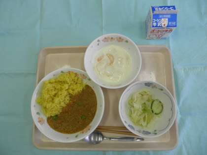 ※2学期はじめの給食は、ドライカレーです。カレーの具にはひき肉やたまねぎ、大豆などを使っています。