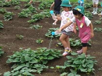 1年生が世話をしている農園のサツマイモは,順調に育っています。今日も,水をやりに行きました。ところが,この後,本降りの雨になりました。結果的に,水をやる必要はありませんでした。しかし“愛情”を注いだことは,きっとこれからの成長に役立つと思います。