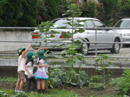 好奇心旺盛な1年生は,大きなヒマワリを見つけ,背比べをしていました。