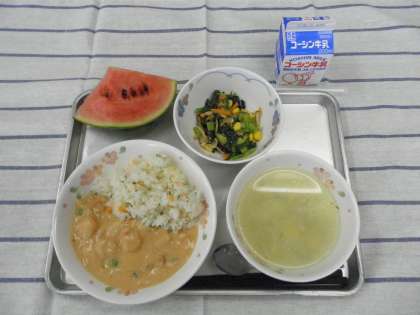 バターライスえびソース ポテトスープ ベーコンえのきサラダ すいか 牛乳